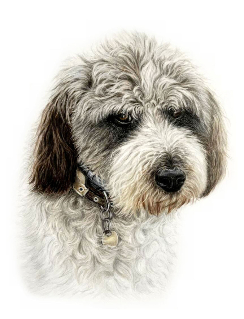 It is beautiful and so (doggie) lifelike – the eyes they seem to follow me. Everyone who has seen it remarked how Sue has done Larry to a T. The keyring she gave me with Larry’s picture in, I have on my walking bag, so anyone who sees – I will certainly tell them who the artist is.